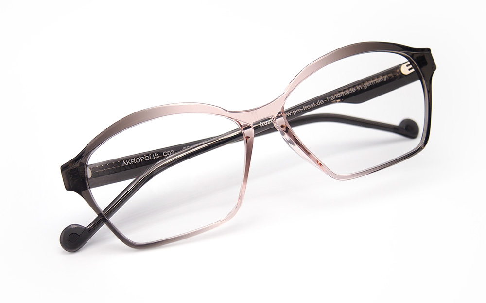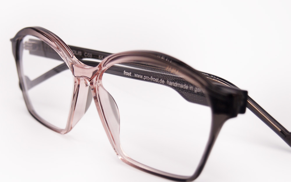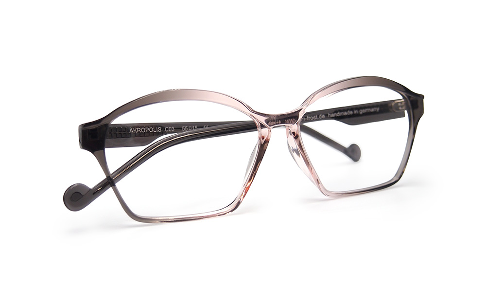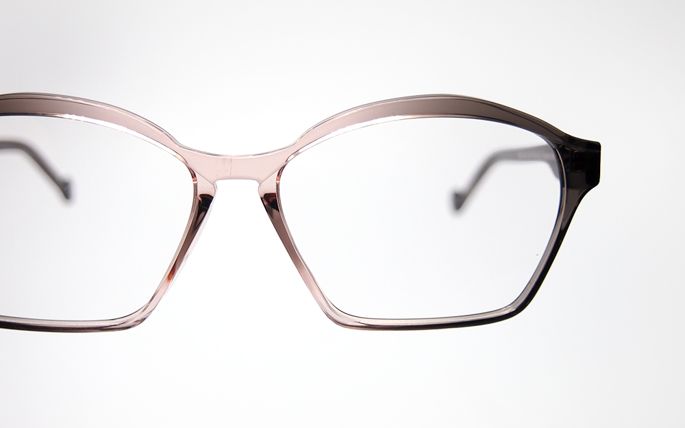 2026.2.10 FROST APROPOLIS c.03 スクエア系でありながら、親しみやすく女性らしさのあるシルエットです。 例えばレンズ上部のブロウラインの両端が細く、中央が太いシルエット。目元の魅力を引き立ててくれます。 レンズシェイプはパウンドケーキの断面のような、一辺がカーブしているかたちです。 フロントのアセテートは、中央がほんのりピンクがかったクリア系から、両サイドに向かってグレーにグラデーションしています。水平方向に色が変化している配色は珍しいです。 すっと面長に見える効果もありそうです。 一般的にありふれた形ではありませんが、細め薄めのアセテートの使い方がされており、使いやすいと思います。サングラスとしても映えると思います。 55□16 / ¥51,480(¥46,800+税・入荷時点での価格です)
